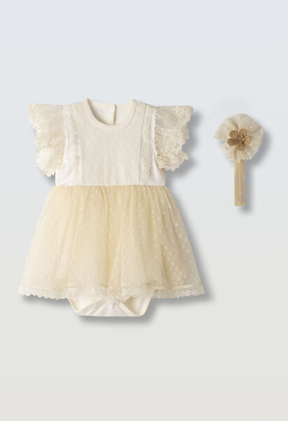 Βρεφικό φόρεμα EBITA για κορίτσι από 3 έως 18 μηνών. Βρεφικό φόρεμα σε εκρού χρώμα με τούλι και κορδέλα.