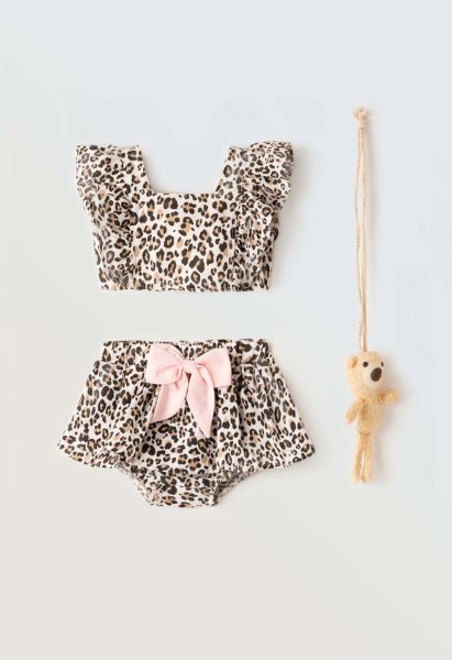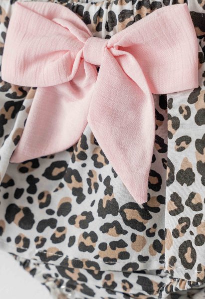Βρεφικό σετ σορτς EBITA για κορίτσι από 6 έως 24 μηνών. Μπλούζα σε μπεζ χρώμα με allover λεοπάρ τύπωμα και μπεζ σορτς με allover λεοπάρ τύπωμα.